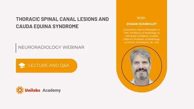 Radiologists encounter various lesions within the thoracic and lumbar spinal canal in clinical practice, either on dedicated imaging studies or as incidental findings on the scans of thorax and abdomen. In this webinar the differentiating features and clues to the correct diagnosis will be described, based on the specific location and characteristic imaging patterns on MRI and CT exams. The possible causes of cauda equina syndrome and their radiological appearances will be presented, as well as the rationale for imaging examinations in this clinical setting.